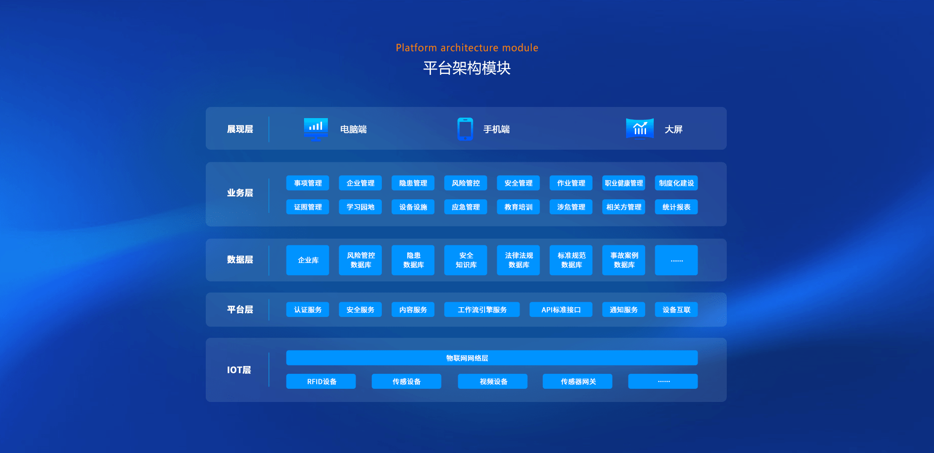 該平臺(tái)基于國家安全生產(chǎn)法律法規(guī)要求及國內(nèi)外安全管理的先進(jìn)經(jīng)驗(yàn),從系統(tǒng)安全管理的角度出發(fā),利用互聯(lián)網(wǎng)、物聯(lián)網(wǎng)、大數(shù)據(jù)應(yīng)用技術(shù),旨在打造全方位的安全管理體系。通過標(biāo)準(zhǔn)化業(yè)務(wù)模塊、全面風(fēng)險(xiǎn)管控機(jī)制、職責(zé)統(tǒng)一的業(yè)務(wù)流,專業(yè)化的安全數(shù)據(jù)支撐、可視化的數(shù)據(jù)呈現(xiàn),提升安全管理效能,實(shí)現(xiàn)企業(yè)安全生產(chǎn)主體責(zé)任落實(shí)到位、全員全過程參與安全管理,建立企業(yè)安全生產(chǎn)長(zhǎng)效機(jī)制,構(gòu)建安全管理健康有序發(fā)展的良性格局。