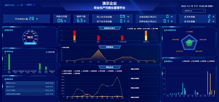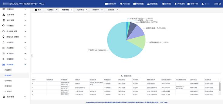 可實(shí)現(xiàn)風(fēng)險(xiǎn)管控、隱患情況、教育培訓(xùn)、證照管理、應(yīng)急演練等不同維度數(shù)據(jù)統(tǒng)計(jì)分析,智能生成數(shù)據(jù)報(bào)表,為,為決策層制定安全目標(biāo)和方針提供精準(zhǔn)的數(shù)據(jù)支撐。