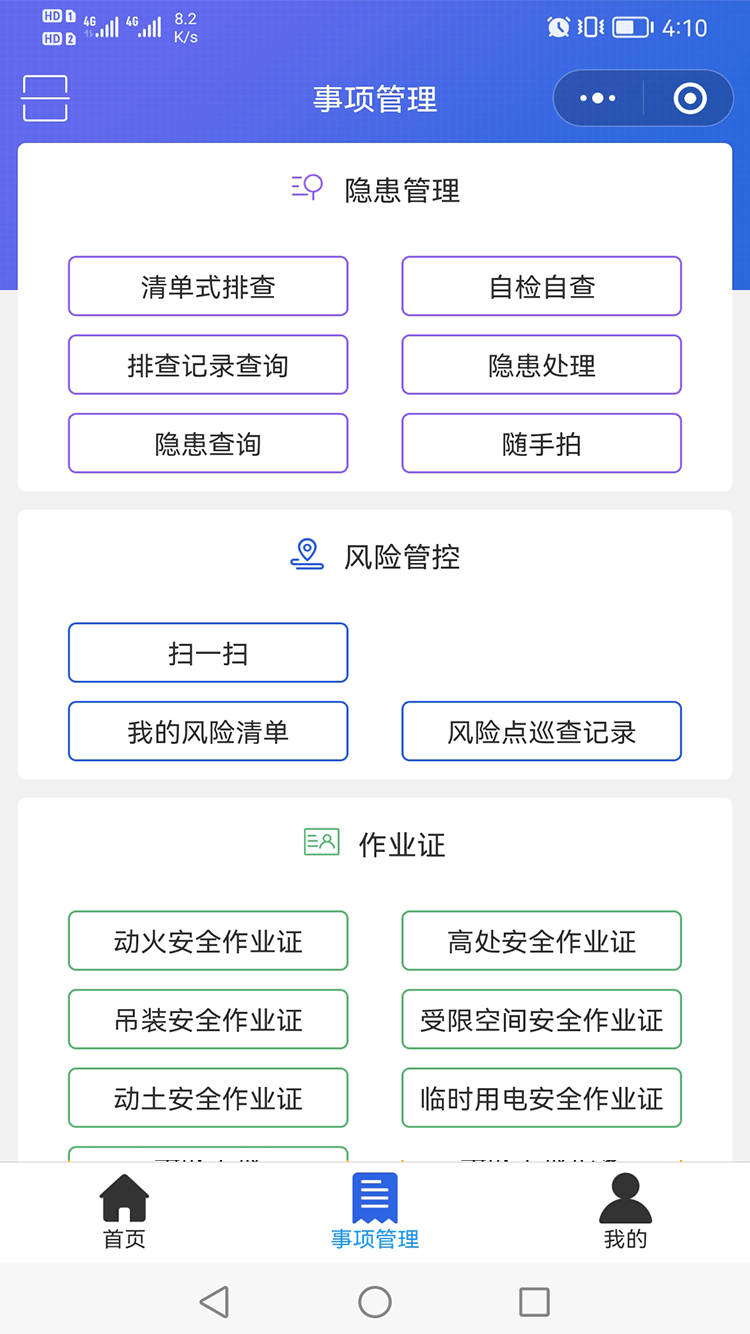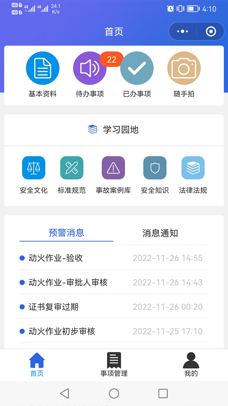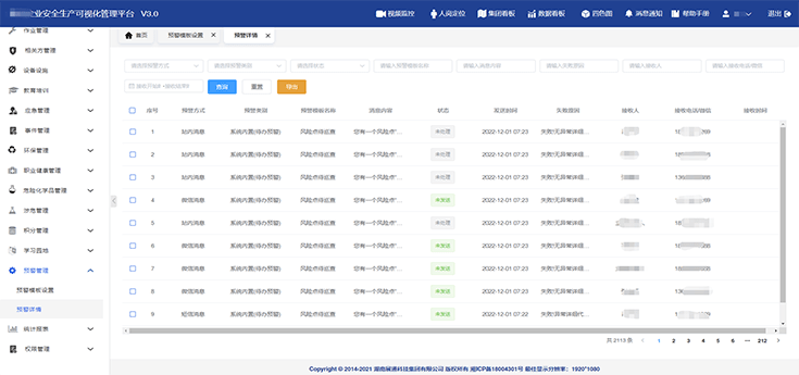 配置相應(yīng)預(yù)警規(guī)則,可實(shí)現(xiàn)隱患整改/復(fù)查、隨手拍審核、風(fēng)險(xiǎn)巡查、證照審核、證件預(yù)過期、特殊作業(yè)流程審批、演練計(jì)劃、應(yīng)急值守等各類工作事項(xiàng)預(yù)警,及時(shí)推送至相關(guān)負(fù)責(zé)人,提醒其進(jìn)行工作處理。