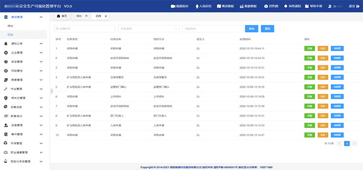 系統(tǒng)根據(jù)登錄用戶角色與權(quán)限,提取了用戶應(yīng)及時(shí)進(jìn)行的工作,在待辦事項(xiàng)中集中展示,方便高效開展安全生產(chǎn)工作;已辦事項(xiàng)記錄了用戶的工作痕跡,以及用戶參與的工作的流轉(zhuǎn)過程。