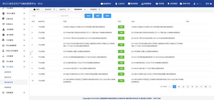 系統(tǒng)配置了企業(yè)安全知識(shí)、安全文化、事故案例庫、標(biāo)準(zhǔn)規(guī)范4大內(nèi)容模塊,可供企業(yè)各層級(jí)工作人員隨時(shí)學(xué)習(xí)或開展培訓(xùn),為企業(yè)營(yíng)造了良好的安全文化氛圍。