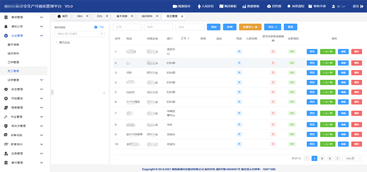 構(gòu)建企業(yè)的基本信息檔案,依據(jù)員工崗位歸屬及職責(zé)劃分,實(shí)現(xiàn)企業(yè)組織架構(gòu)初始化配置,對(duì)工種管理、員工管理、證照管理等模塊進(jìn)行精細(xì)化管理,讓日常管理簡(jiǎn)單規(guī)范。