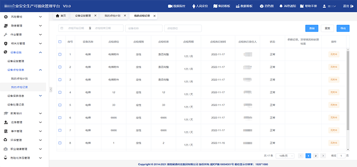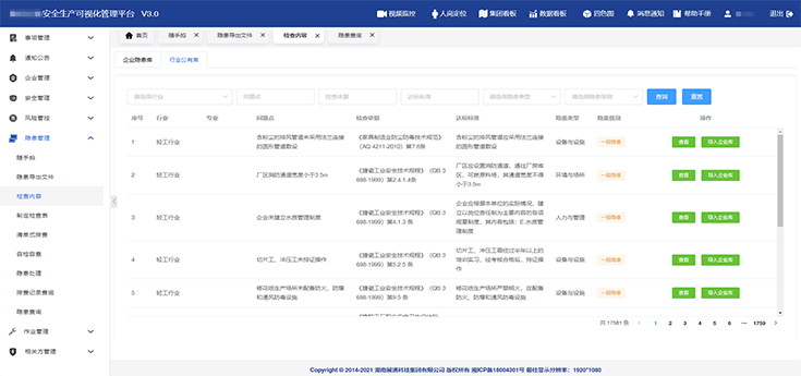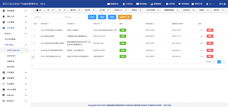 構(gòu)建安全投入(計(jì)劃及費(fèi)用)、各類安全會(huì)議、制度化建設(shè)(法律法規(guī)、合規(guī)性評(píng)價(jià)、規(guī)章制度、操作規(guī)程等)模塊內(nèi)容的臺(tái)賬,便于實(shí)時(shí)查詢與調(diào)取。