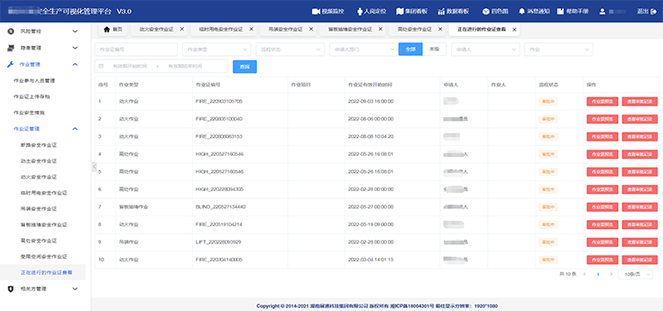 制定標(biāo)準(zhǔn)的特殊作業(yè)線上流程,節(jié)省線下審批時(shí)間,作業(yè)環(huán)節(jié)可追溯,支持在線打印作業(yè)證,實(shí)現(xiàn)特殊作業(yè)數(shù)字化管理。