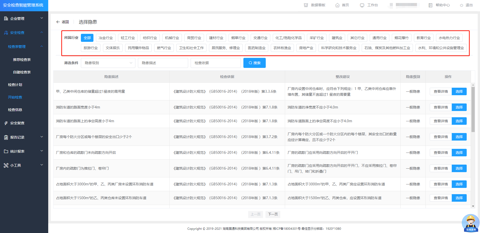 系統(tǒng)涵蓋了30個(gè)行業(yè),近400個(gè)專業(yè)的隱患數(shù)據(jù)庫。所有數(shù)據(jù)均依據(jù)國家現(xiàn)行法律法規(guī) 技術(shù)規(guī)范進(jìn)行深度挖掘,對(duì)應(yīng)隱患描述、檢查依據(jù)、整改建議、隱患級(jí)別等一目了然,安全檢查工作提供精準(zhǔn)規(guī)范的數(shù)據(jù)支撐。