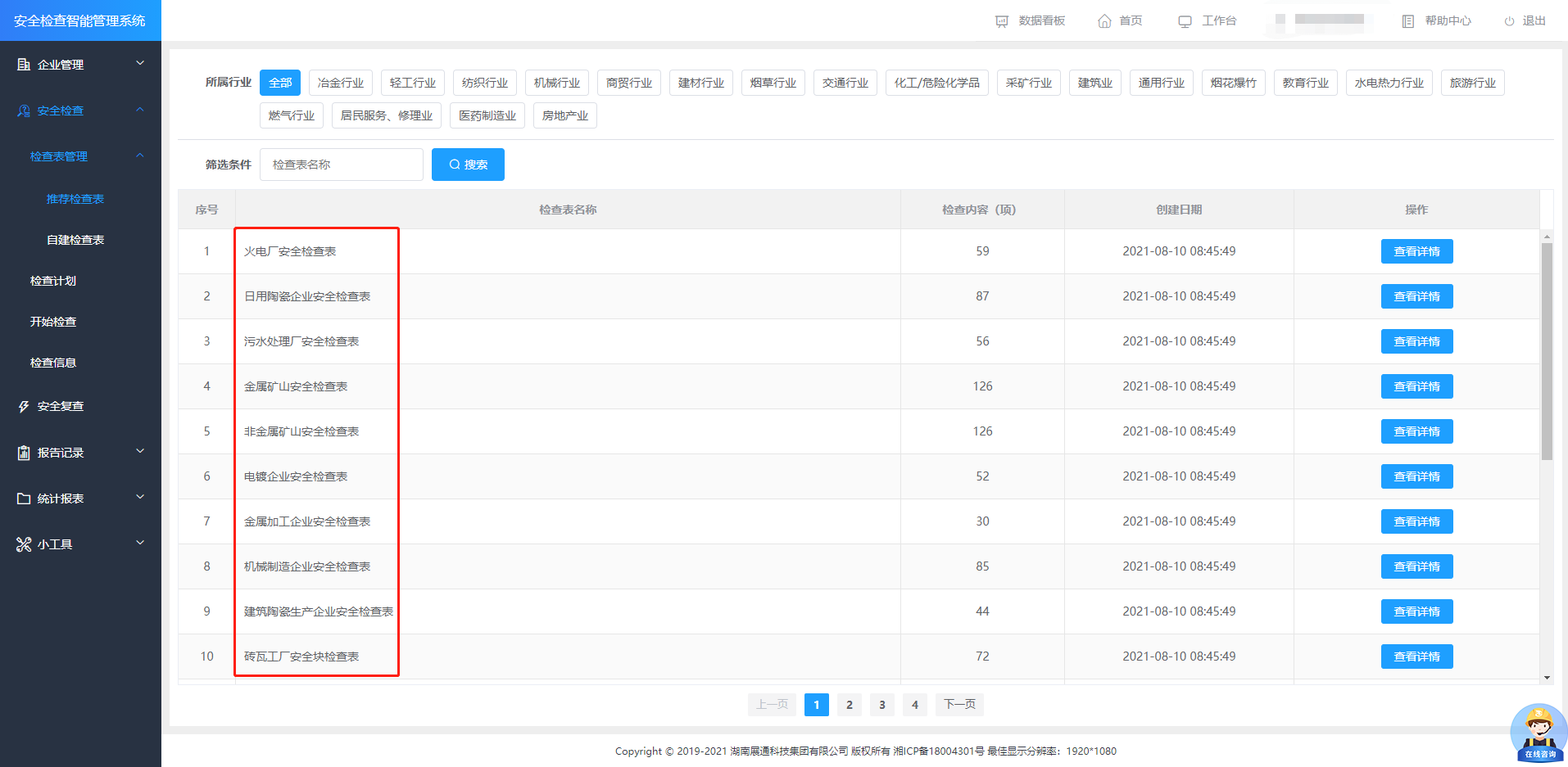 系統(tǒng)內(nèi)置“推薦檢查表”,涵蓋八大工貿(mào)、化工、建筑等多個(gè)行業(yè),可為安全檢查提供全面精準(zhǔn)的檢查項(xiàng)目,實(shí)現(xiàn)“清單式”檢查,有效解決問題點(diǎn)發(fā)現(xiàn)不全,檢查不全面等問題。