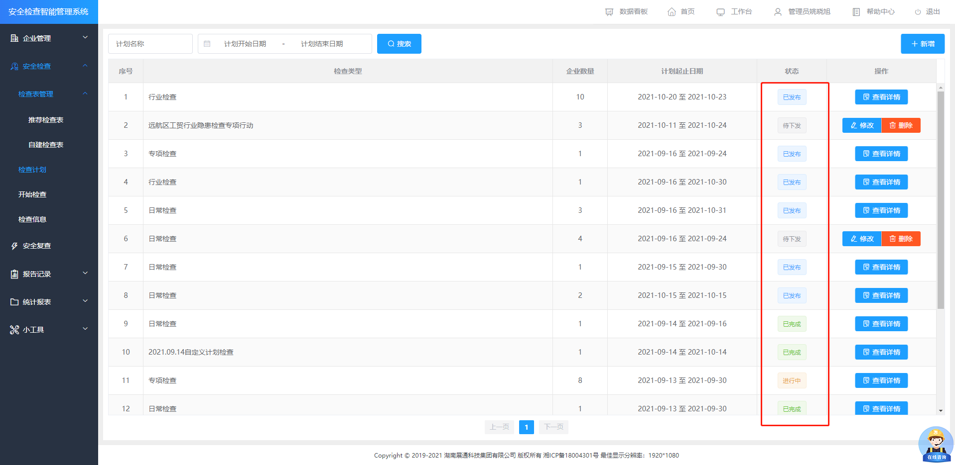 全面整合安全檢查工作業(yè)務(wù)數(shù)據(jù),比如檢查和復(fù)查情況、隱患整改率等統(tǒng)計(jì)、企業(yè)安全檢查工作開展排名、人員安全檢查工作執(zhí)行排名、檢查計(jì)劃實(shí)施進(jìn)度等一目了然,為有的放矢地開展安全檢查工作提供數(shù)據(jù)支撐。