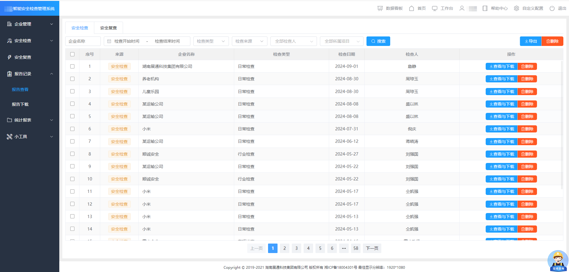 隨時(shí)查詢安全檢查記錄,直觀展示檢查企業(yè)、檢查時(shí)間、檢查人及對(duì)應(yīng)的檢查詳情有效解決紙質(zhì)臺(tái)賬儲(chǔ)存空間大容易損壞丟失等問題,支持下載或批量導(dǎo)出報(bào)告,方便快捷。