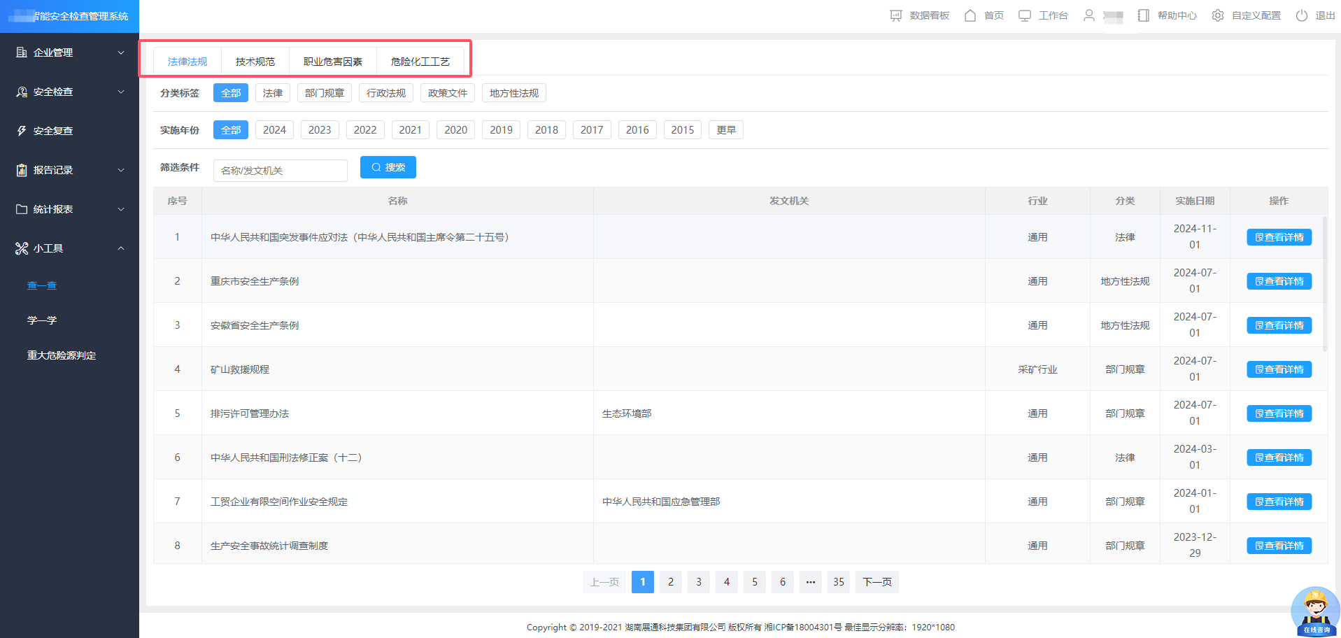 系統(tǒng)內(nèi)設(shè)“查一查”、“學(xué)一學(xué)”功能,提供法律法規(guī)、技術(shù)規(guī)范、危險(xiǎn)化工工藝、職業(yè)危害因素、安全知識(shí)庫、事故案例庫等便捷查詢,快速輔助安全人開展安全檢查工作,彌補(bǔ)個(gè)人專業(yè)知識(shí)短板。